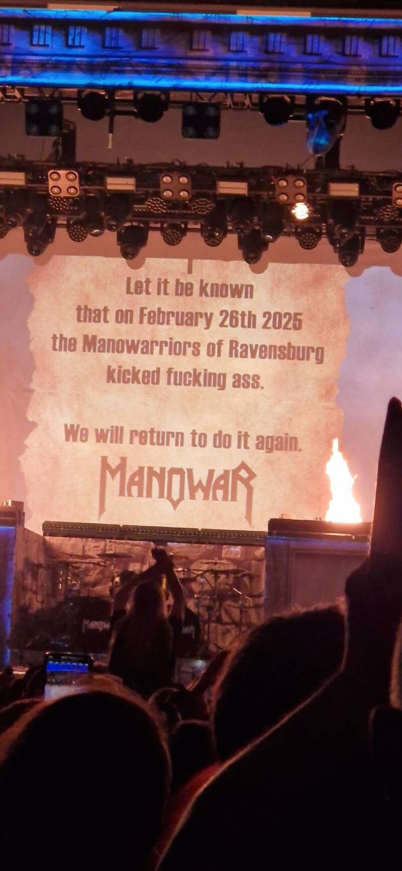 Und so sehr ich politischen Populismus verachte, so sehr liebe ich ihn in der Musik. Vor allem, wenn er von MANOWAR gemacht ist. Die "Kings of Metal" waren im Februar bei uns im schönen Oberschwaben und spielten das komplette "Sign of the Hammer"- Album durch. Das war das Konzept der Tour: ein Abend "Hail to England", ein Abend "Sign of the Hammer". Dazu natürlich die Creme des TRUE METAL: "Kings of .. na was...?", "Black, Wind, Fire and Steel", "Fighting the World", "The Power".... MANOWAR sind trotz ihres fortgeschrittenen Alters unter Dauerstrom, befreien die Welt mit chirurgischen Operationen vom FALSE METAL und rufen ihre "Warriors of the World" zum "Final Battle". DEATH TO FALSE METAL: Forever. Ernsthaft: der Comedy-Faktor von MANOWAR ist natürlich nicht ganz zu leugnen, aber: ein routiniert agierendes Uhrwerk, das mit seinem Bass-Live-Druck immer beängstigend-dominanter wird und eine Stimme, die einfach nur HEROISCH zu nennen ist. ERIC ADAMS- Voice of Walhalla. Love. Mein soziales Umfeld weiß, was jetzt kommt: OTHER BANDS PLAY....